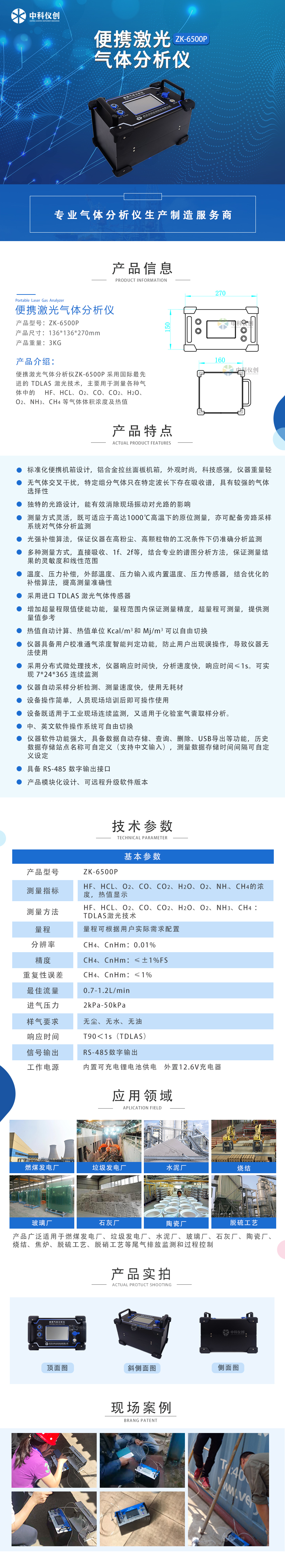 在线紫外气体分析仪 ZK-6400 本公司自主研发生产的ZK-6400系列在线紫外气体分析仪,主要基于紫外差分吸收光谱分析(DOAS)技术和自主设计的气体吸收池、高稳态光源、紫外光谱仪以及高精度信号处理单元,完成气体在紫外波段的定量分析,主要测量SO2、NO、NO2、O2、NH3、CO、CO2、Cl2、O3、H2S、HCl、CH3I(可根据客户需求扩展)等气体浓度。分析仪具有精